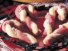 - For each candy cane, shape 1 rounded teaspoon dough from each half into 4-inch rope by rolling back and forth on floured surface. Place 1 red and white rope side by side; press together lightly and twist. Place on ungreased cookie sheet; curve top of cookie down to form handle of cane.