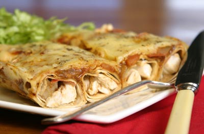 6. Fill each flour tortilla with the chicken mixture and roll up. Place seam side down in the prepared baking
