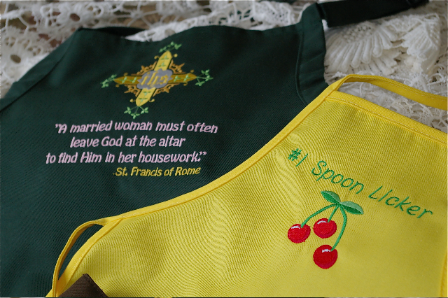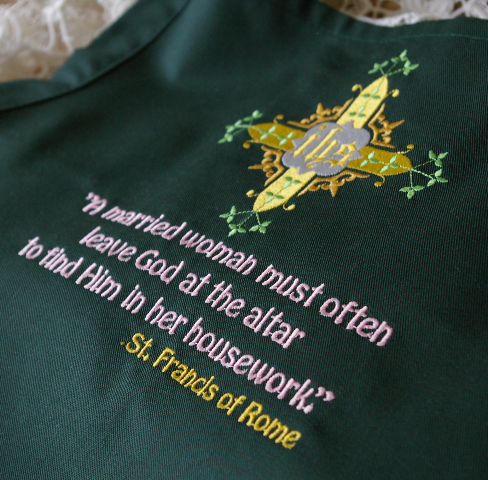 - One hunter green, twill adult apron with adjustable strap embroidered with an IHS cross and pink quote of St. Francis of Rome: "A married woman must often leave God at the altar in order to find Him in her housework."