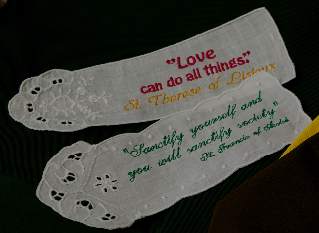 - Two white eyelet bookmarks embroidered with various saints’ quotes: "Love can do all things. ~ St. Therese of Lisieux" and "Sanctify yourself and you will sanctify society. ~ St Francis of Assisi"