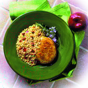 3. Scatter the apples around the chops and pour in the broth. Cover the skillet and turn the heat to low. Cook about 5 to 10 minutes, turning the chops once, until they are tender and just slightly pink when cut near the bone. Serve immediately.