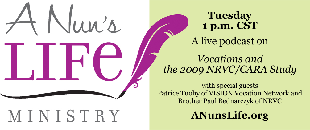Tomorrow at 1 p.m. CST, Sisters Julie Vieira, IHM, and Maxine Kollasch, IHM, of A Nun's Life Ministry will be hosting a live podcast on Vocations and the 2009 NRVC/CARA Study. They will be interviewing Brother Paul Bednarczyk, CSC, Executive Director of the National Religious Vocation Conference, and Patrice Tuohy, Executive Editor of VISION Vocation Guide.