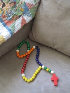 If you can imagine Little Tikes having a Marian Devotion division, that’s what this big chunky rosary is like. It was a gift from a lovely lady at a parish where I did a book talk. It’s been in that drawer for a while; when Matthew first got it, he was pretty young, and I was afraid to let him play with it without supervision. So it has been rather forgotten there in the front room. I grabbed it, settled onto the couch, and began to pray.