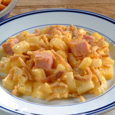 1. In 3 1/2 or 4-quart slow cooker, layer half each of the potatoes, onion, ham and cheese; repeat layers. In small bowl, combine soup, milk and thyme; pour over top.