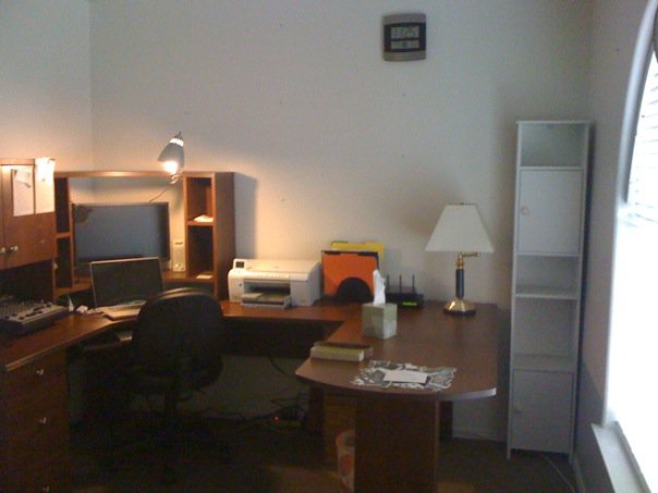 Part of what has spurred this renewal of interest in personal blogging is my move into my new office this past weekend. I should really call it a "half move", since I have stuff stashed between three rooms at the moment. I told myself I didn't want to just dump everything into the new office, but rather take my time and use this as an opportunity to see how much "stuff" I really need in here. My new office -- Greg's old one -- has more natural light and a lovely window that looks out over our front yard. I'm upstairs, where it's warm and bright and I can see the UPS guy pulling up with deliveries. I expect to like it in here - to be more organized and productive.