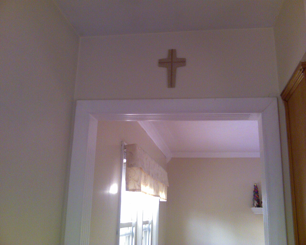 This cross has no emotional attachment for me and is not a crucifix but the value it holds, whether I am conscious of it each time I pass beneath or not, is unbelievable. It is a symbol that represents my faith in God that He made the greatest sacrifice possible for me. God did not sacrifice the life of His only son just for those people in Jerusalem over 2,000 years ago. God made that sacrifice with little old me in mind, insignificant me, who lives in an ordinary house, raising children like other moms all over the world. God did it for me, no one famous, no one who is going to change the world with earth shattering discoveries for the cure for cancer, no one who will make mankind forge peace forever. Nope God did it for me, he loved me that much that He stretched out His human arms in Jesus between the heavens and the earth and gave up His spirit so that I may learn to love selflessly, so that my sins would be forgiven, so that I may someday reach God and become one with Him.