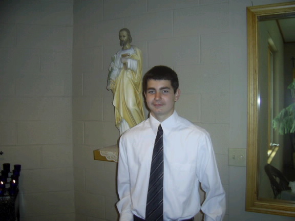 Ben grew up but he didn't move on. He was a member of our family. He often spent the weekends at our home and we joked frequently that he would have come over even if it was just my dad to hang out with. Sunday morning often saw us all in a pew. By then two sisters and a brother had move away and the pew wasn't quite as full, but Ben came nearly every week. It was at that church on a Palm Sunday that a spark was lit. Ben wanted to know more about Jesus. Something-the Passion perhaps, or our church's intricate wood crucifix-resonated within him. Merely eight years old at the time he could have ignored this, this desire to know Jesus more. But he didn't. In fact he began to collect religious items to remind himself of Jesus. My mom mentioned receiving his first communion and for 2 years, two years, Ben dragged his parents to class, parents who had never been religious but who could see this desire in their son. Adults three times his age could not have been more dedicated or joyful about the religious ed classes. What a witness!