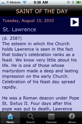 Today I'm happy to help spread the word about one of my favorite new spiritual tools, Saint of the Day from St. Anthony Messenger Press. I received a promotional version of this app, which retails for $2.99 in the iTunes app store and have been happily reviewing its features for the past week. I will say that $2.99 is higher than I typically pay for apps, but since this particular app has all but taken the place of my favorite "Lives of the Saints" book, I feel the price is a good value for the resources the app provides.