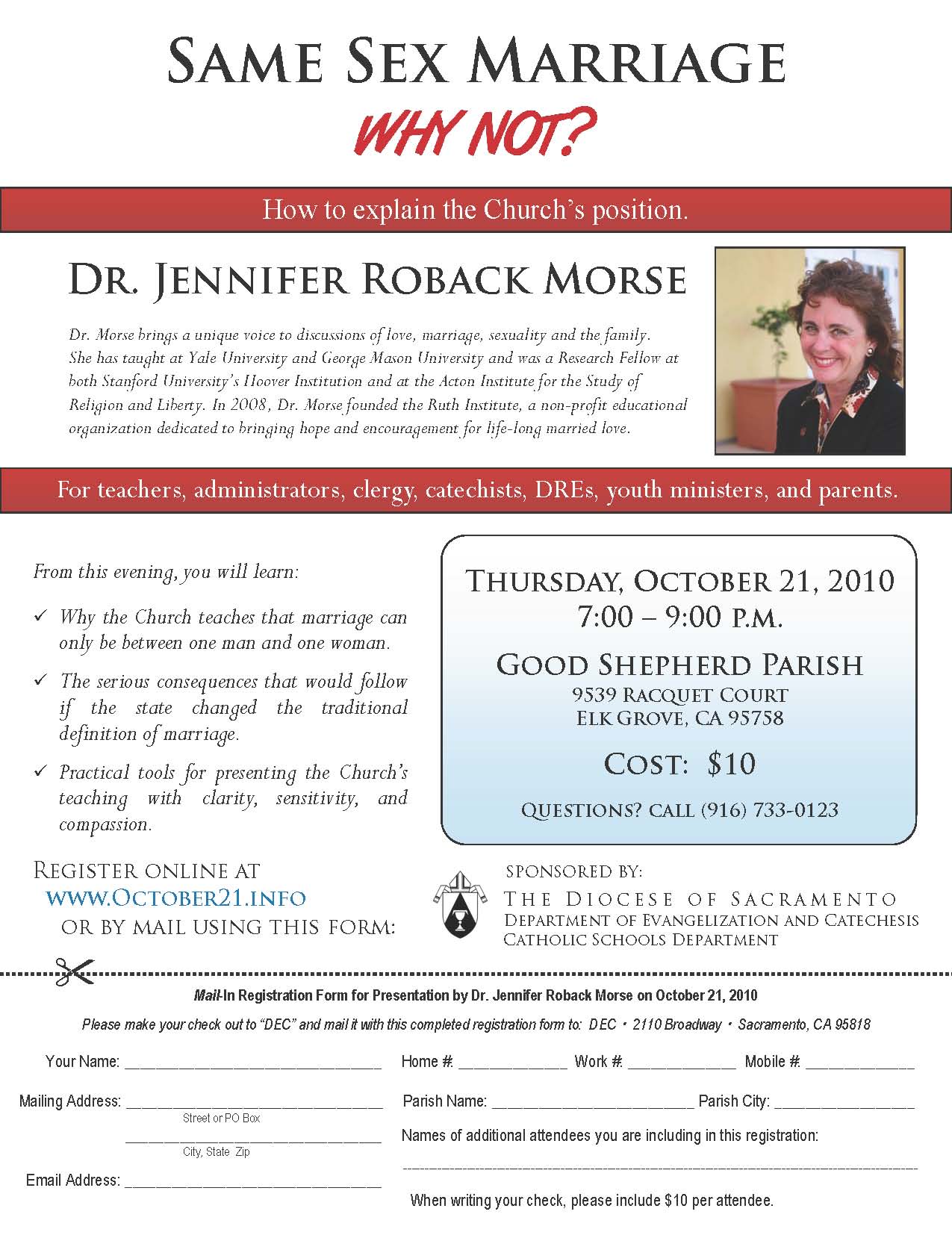 Readers living near the Diocese of Sacramento will want to mark their calendars for a special event with Dr. Jennifer Roback Morse. On Thursday, October 21 at 7:00 pm Dr. Morse will speak on the topic "Same Sex Marriage: Why Not?", explaining the Church's teachings on this topic.