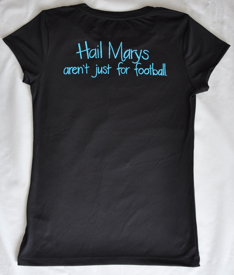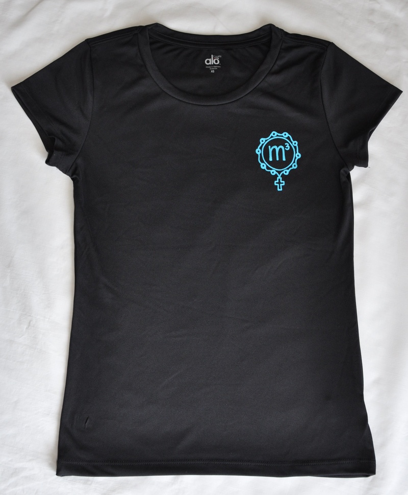A few weeks ago, I received a special surprise in the mail. The box, mailed to me by Lisa Green - a co-founder of Mamas Movin' with Mary - held an adorable exercise t-shirt neatly tied with a bright blue bow, a sweet note, and a small Rosary chaplet. I'd read about the Mamas and their rosary praying, workout sharing ways over at Faith & Family Live and had noted how adorable I thought the shirt was. But like most of you moms, I rarely buy things for myself online so I made a mental note to put this on my wishlist for the future. So imagine my glee when I was inducted into the Mamas with a shirt of my own!