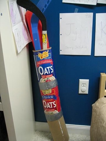 3. Three oatmeal canisters taped together for the tall toys - hockey sticks, baseball bats, swords. This was an inspired and much-needed creation!