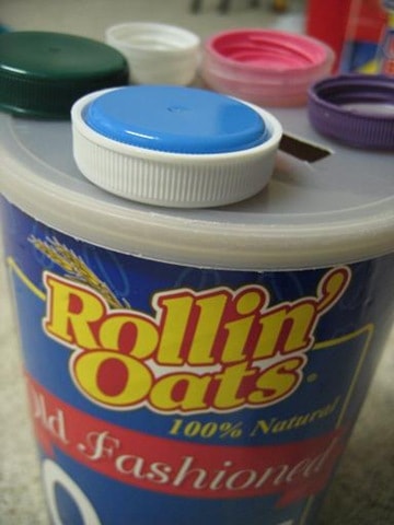 Made from an oatmeal canister and caps from milk, juice and water bottles, it serves as an "in and out game" toy for 8-18 mos., then a small motor skill toy for toddlers (putting the caps in the slot), then a sorting by color and counting manipulative for the preschool set. And all for zero dollars.
