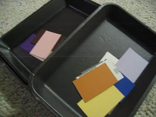 6. For flat games cut from magazines or perhaps Montessori works like this one, Styrofoam trays like the ones I hate getting from my reduced produce section end up working well: