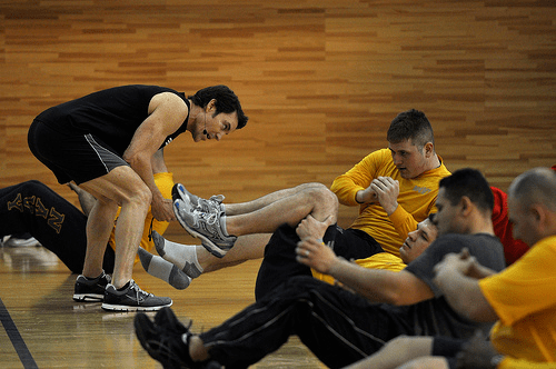 The yoga I've done most recently was via P90X videos with Tony Horton, the buff guy making men in the armed forces kill their abs in the photo above. He says yoga is essential for flexibility and overall fitness and highly recommends it, but he's much more likely to talk about not eating butter in your mashed potatoes or "standing on your tippy toes" than he is a heart center or a collective consciousness. He's no Hindu shaman, believe me.