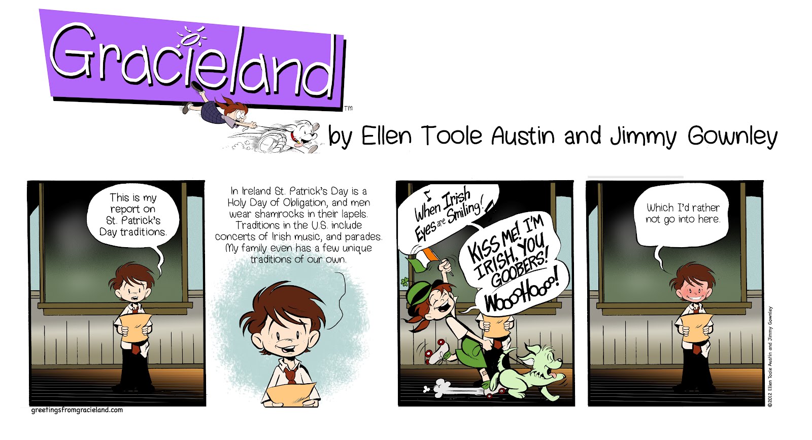 Editor’s Note: We're celebrating St. Patrick with this week's installment of Greetings from Gracieland, our fantastic new webstrip from Jimmy Gownley and Ellen Toole Austin. Along with the comic, you’ll find “Table Talk”, a terrific conversation starter to share with your children. Be sure to visit the Greetings from Gracieland website at www.GreetingsFromGracieland.com for more fun and inspiration with Gracie and join us here each Thursday morning for a new feature! LMH