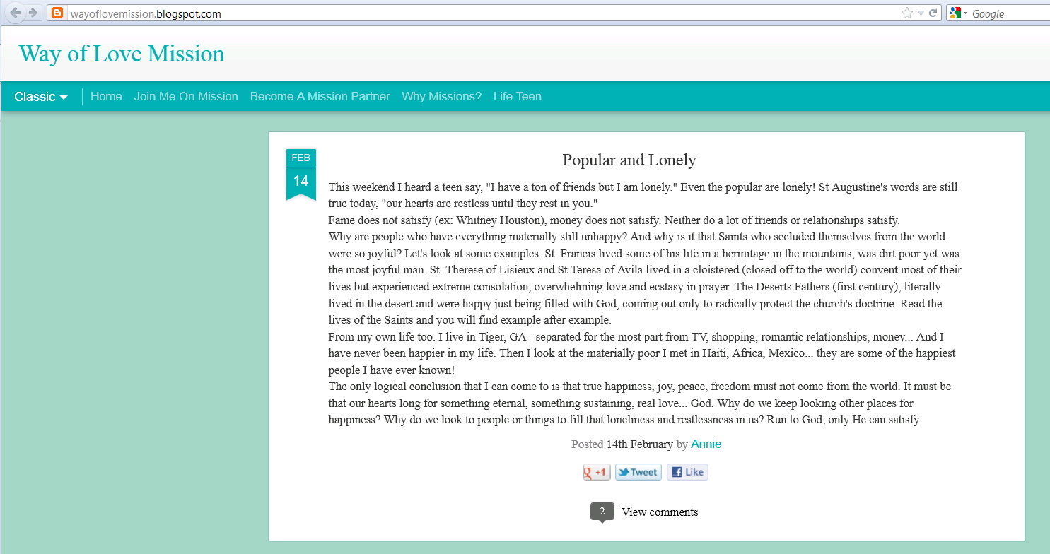 Annie: I am a missionary simply because I responded to the depths of what my heart wanted... to love. Walking around seeing all the unhappy people, I couldn't just continue living my life happily in Jesus as if I didn't acknowledge their pain. Offering the love of Jesus to people is so simple yet often overlooked. I used to think, "I don't want to impose my beliefs on others." But, if people were made by God and made to long for God then they cannot be fully alive unless they have Jesus' love to bring them joy. Then no matter what others might tell you or think they need... the depths of their being wants Jesus. So I am a missionary to love the empty, unhappy, and falsely happy. I've seen the most hardened hearts find peace, freedom and joy in Jesus. Knowing that what Jesus brings is Life to the fullest... no matter what persecution I face, I don't have any reason not to preach the gospel of truth.I started my blog because my step dad asked me to and said he would pray a rosary for every post. So at first I posted every day... just to get him to pray :) Now I can see the genius of his idea. Whenever faith is shared... it blesses people so I'll continue blogging because I can see the ripple effect faith has on others.