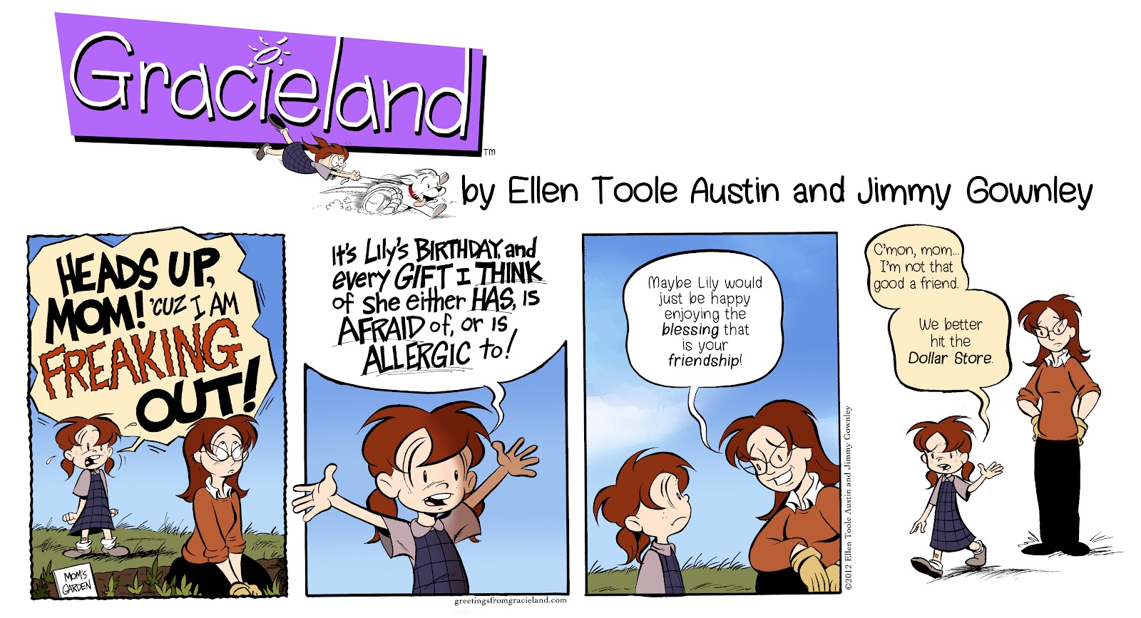 Editor’s Note: We hope you enjoy this week’s Greetings from Gracieland, our fantastic webstrip from Jimmy Gownley and Ellen Toole Austin. Along with the comic, you’ll find “Table Talk”, a terrific conversation starter to share with your children. Be sure to visit the Greetings from Gracieland website at www.GreetingsFromGracieland.com for more fun and inspiration with Gracie and join us here each Thursday morning for a new feature! LMH