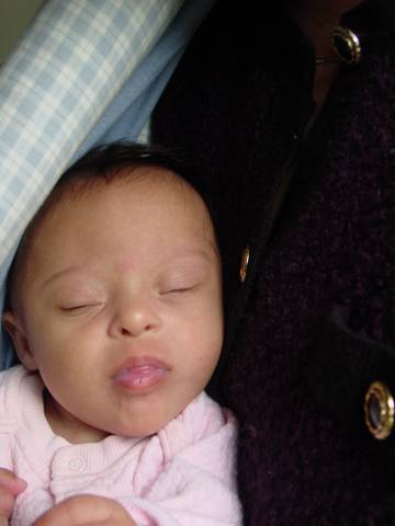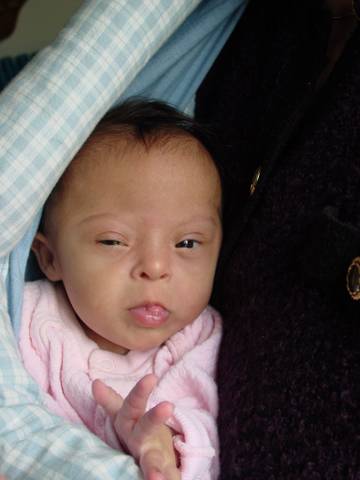 However, a precious opportunity, to photograph her as a newborn had passed me by. Or so I thought. Last Saturday I was speaking at the Connecticut Right to Life Convention, and Dr Brian Clowes of Human Life International was waiting his turn to present. We had met before, in 2002, when Christina was one month old. He asked my permission to take photographs of her. I was flattered because, by taking her photo, he treated Christina, the baby with Down syndrome so often rejected by society, as evidenced by the 90% abortion rate, as a celebrity. She was sound asleep in the baby sling, and we walked over to the window to catch the afternoon sunshine.