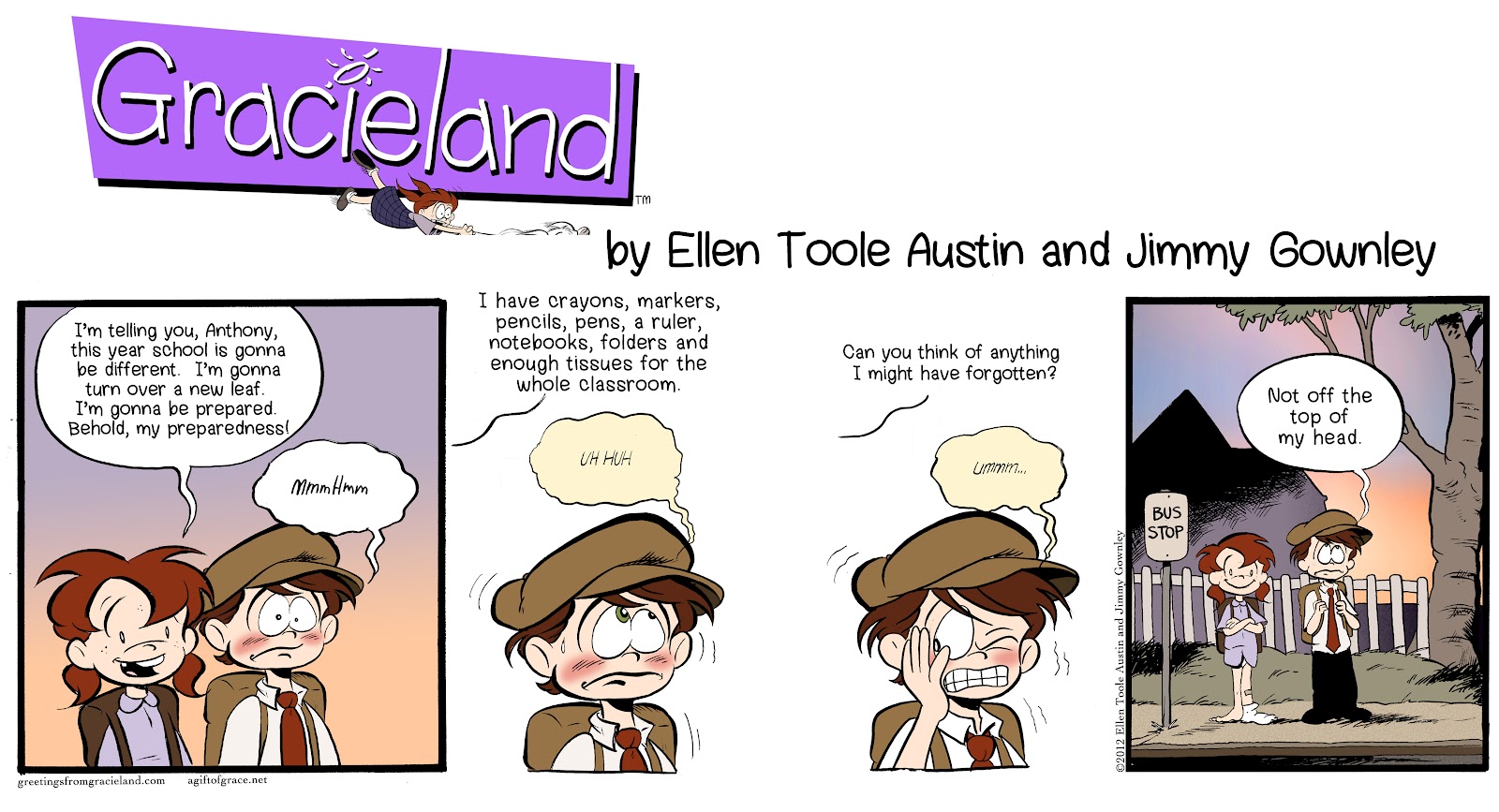 Editor’s Note: We hope you enjoy this week’s Greetings from Gracieland, our fantastic webstrip from Jimmy Gownley and Ellen Toole Austin. Along with the comic, you’ll find “Table Talk”, a terrific conversation starter to share with your children. Be sure to visit the Greetings from Gracieland website at www.GreetingsFromGracieland.com for more fun and inspiration with Gracie and join us here Thursday mornings for a new feature! LMH