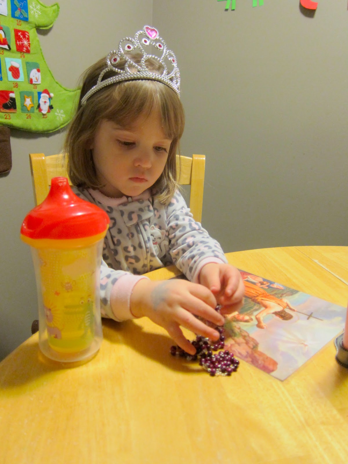 Weeks later, Janie still asks for "the purple Rosary." She loves asking about the laminated images and is able to identify the various figures. She told me today that "Jesus has long hair like Rapunzel." Oh, the sweet innocence of children! Janie loves getting to kiss Jesus' feet on the Crucifix of her Rosary at the end of our prayer and blow out the candle.