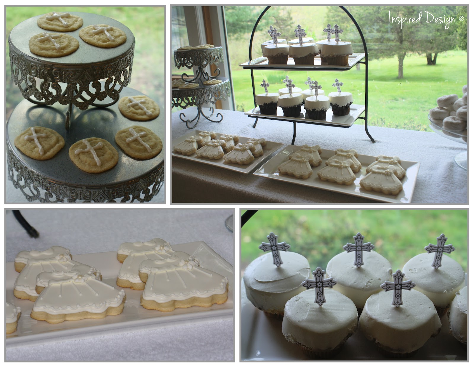 With the First Communion party food, keep in mind that presentation goes a long way even if the food itself is very simple. The easiest way to give your food presentation pop is to do layers or tiers. If you don't have fancy tiered serving trays or can't borrow some, create the tiered effect by stacking up boxes, tupperware, or even books and drape a table cloth over them. Keeping a unified color theme is good too, even just picking a single color works well. A clean, uncluttered display of simple foods like cookies and cupcakes goes a long way.