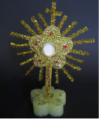 I think the best crafts are those that can do double-duty, not only catechizing your kids but that can also be put to use at the First Communion party, such as First Communion banners, First Communion shortbread cookies, and First Communion party favors. Catholic Icing is a fabulous online resource for Catholic crafts for kids. I love this kid's monstrance craft that would tie in well to preparing your child for First Communion. And it would be great to show off at the First Communion party too.