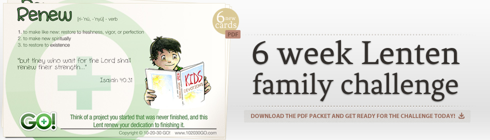 This Lent join 10-20-30GO! Families Functioning Faithfully in their Family Lenten Challenge! 10-20-30GO! was designed specifically as a parenting communication tool that utilizes positive parenting, a kid’s chore chart, prayer board and provides parents with a weekly theme. It entails 10 minutes of prayer, 20 minutes of reading and 30 minutes of chores per day. In addition to the original Family kit (http://www.102030go.com/products/Family-Kits), this Lent, they are introducing a six week program geared toward guiding and preparing your family for Easter. You can find the downloadable version on their website (http://www.102030go.com/products/Family-Kits?product_id=7) for $5.95.