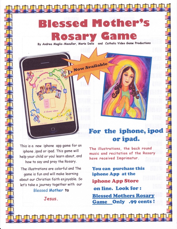 The “Blessed Mother Rosary Game” is available on iTunes. To order the cd of the game or to view other examples of Maglio-Macullar’s beautiful art, please visit her website at www.andsart.weebly.com.