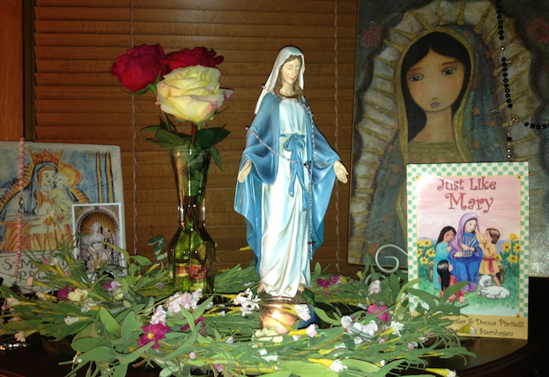 Who knows, maybe one Hail Mary will lead to another … and another … and another, and by May 31we’ll have worked our way up to full Rosary. No matter, I’m glad we have our May altar to provide a beautiful backdrop for our family’s prayer time.