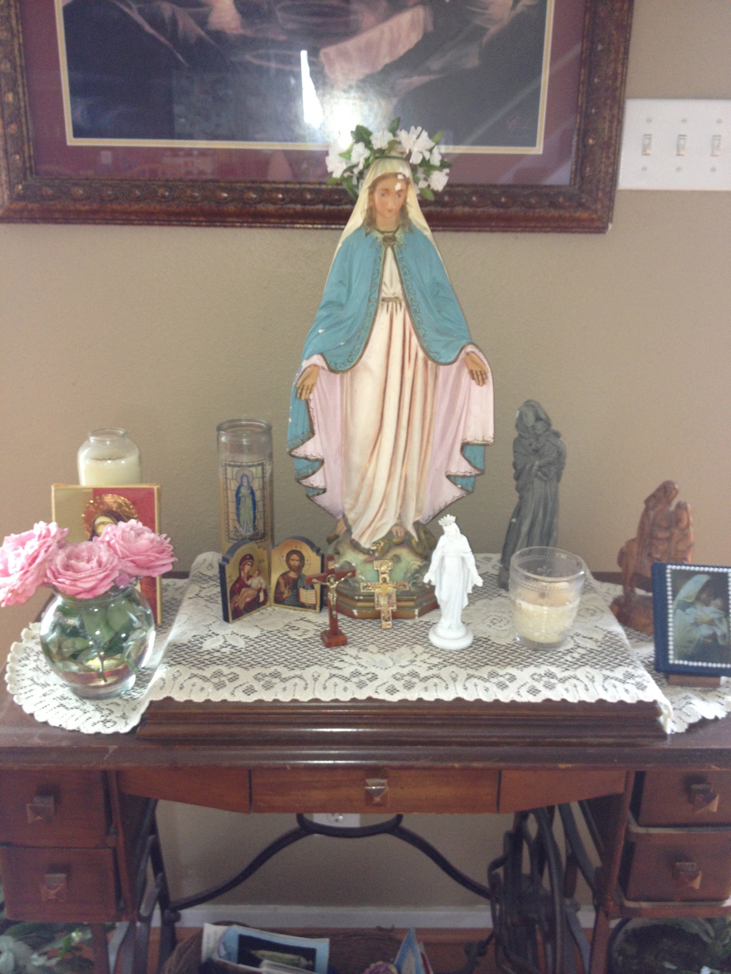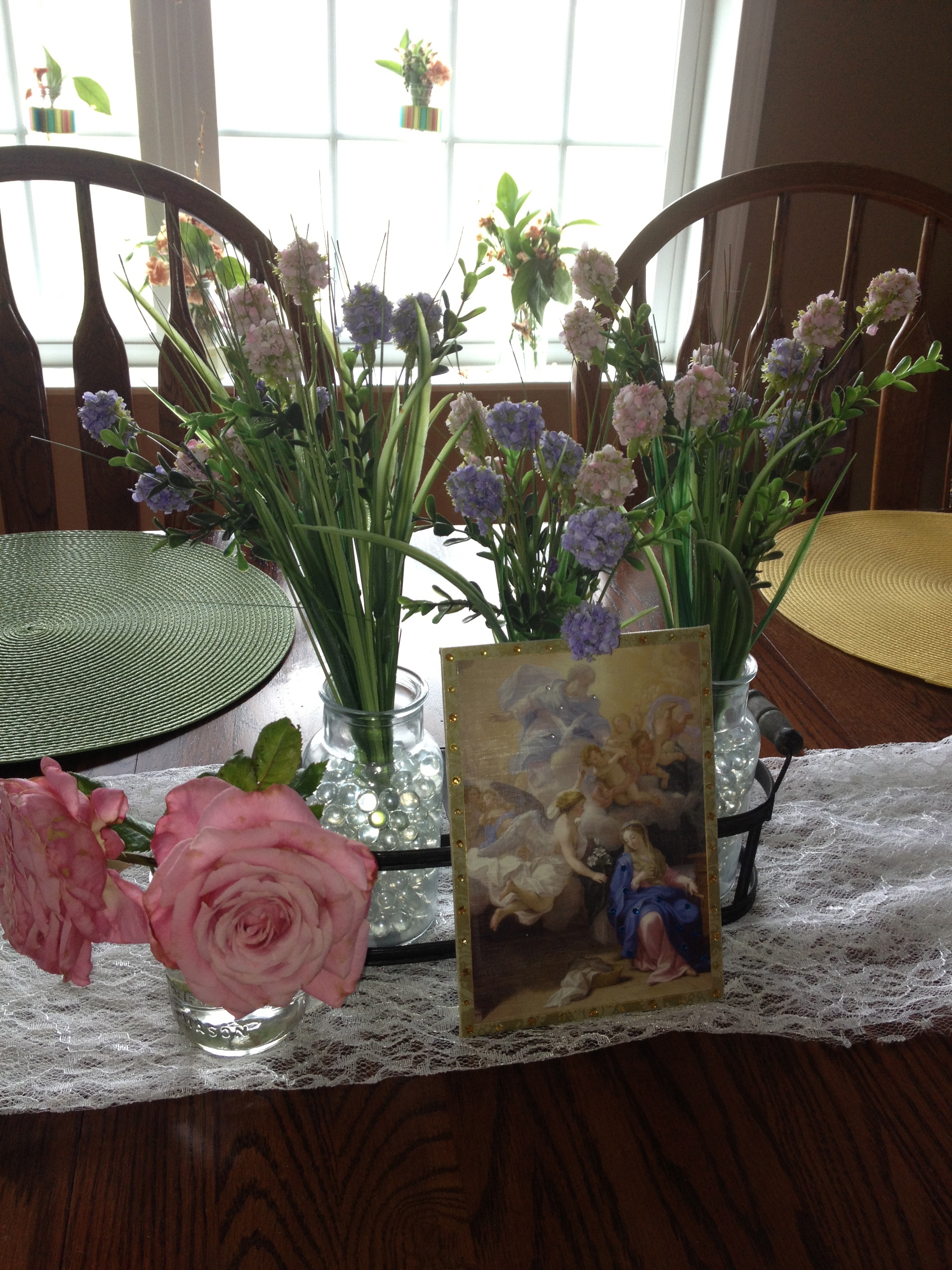 First, something that is simple and really will bring about a new admiration of the Blessed Lady is to set up an area in your home in which to honor her. It doesn’t have to be a full-blown “shrine” but something simple that you can add to and take away over the days. You might even keep it small enough that you can move it around so like other art and family photos that have lived in a certain spot for so long, she doesn’t get ignored. If you have a statue, be sure to add a crown during her month of May. Maybe even make it a five minute ceremony with your family to crown her.