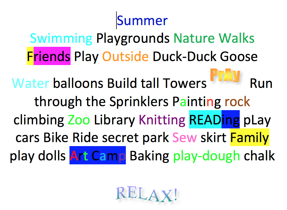 - Our plan actually consists of a word collage of our favorite things about summer. I print it out and stick it on our fridge for daily inspiration.