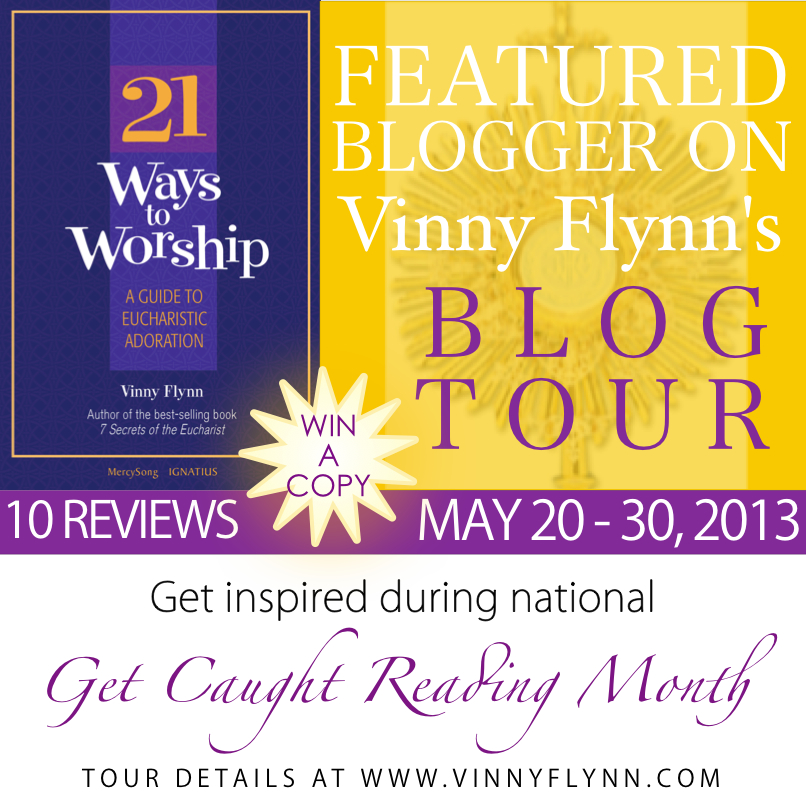 OK, enough of "true confessions of Catholic Mom". And enter Vinny Flynn's amazing book 21 Ways to Worship: A Guide to Eucharistic Adoration. From it's bright purple cover to its amazingly inviting tone, this is the book that will smash your previously held misconceptions of Adoration. Vinny's tone is fun, inviting, and actually infectious. His sharing of his own personal experiences will have you nodding, smiling, and feeling less guilty than perhaps you've felt in the past. Adoration is a gift -- indeed the greatest gift we can receive -- and Vinny is the friend who wants to hold your hand and lead you to its riches.