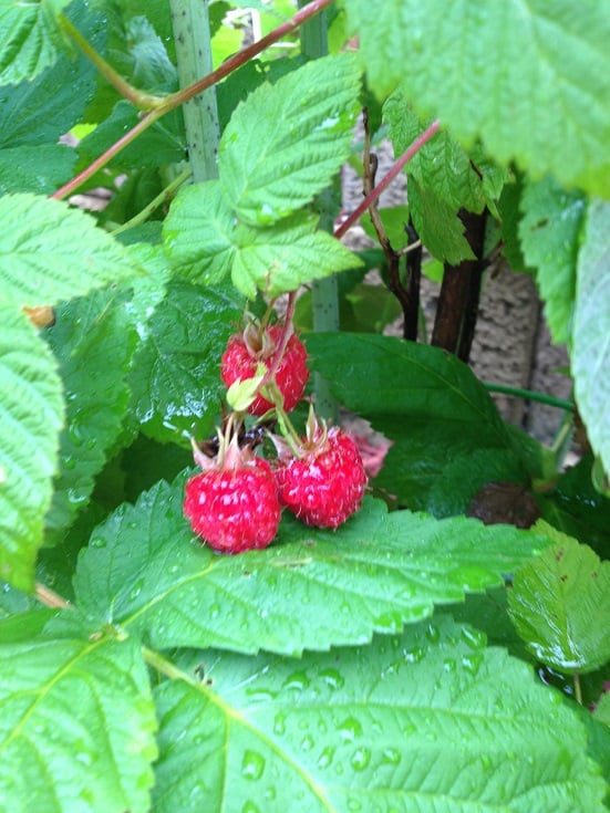 As I was sipping my coffee and sighing over the mess, I caught sight of all the berries turning bright red on the vine. I'm totally aware of how many tweets and facebook statuses have been about the raspberries that are growing so abundantly in my garden, and I am amused by it. This is the same woman who tried to kill an African Violet twenty-eight years ago, and embraced the brown thumb responsible for killing every houseplant I came near since The Great Crispy Violet Episode of 1985.