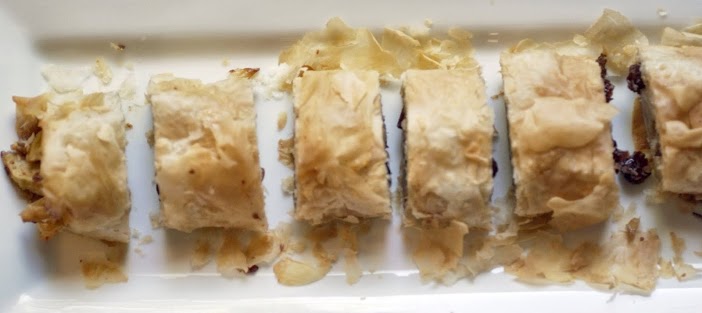 Mound half of the filling in a 3 inch strip along the narrow end of the phyllo leaving a 2 inch border.