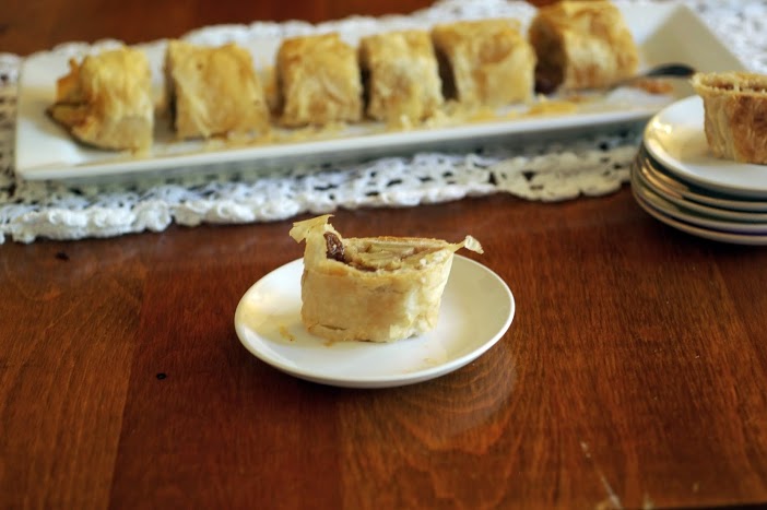 Place one sheet of phyllo dough on a kitchen towel and rush with butter. Place another sheet over that one and brush again with butter. Repeat until you have five sheets stacked on top of each other