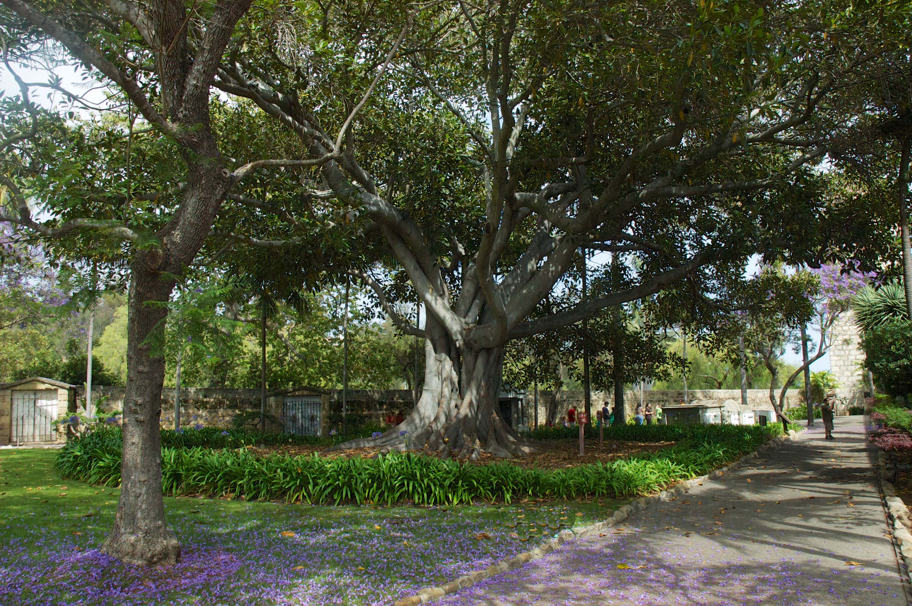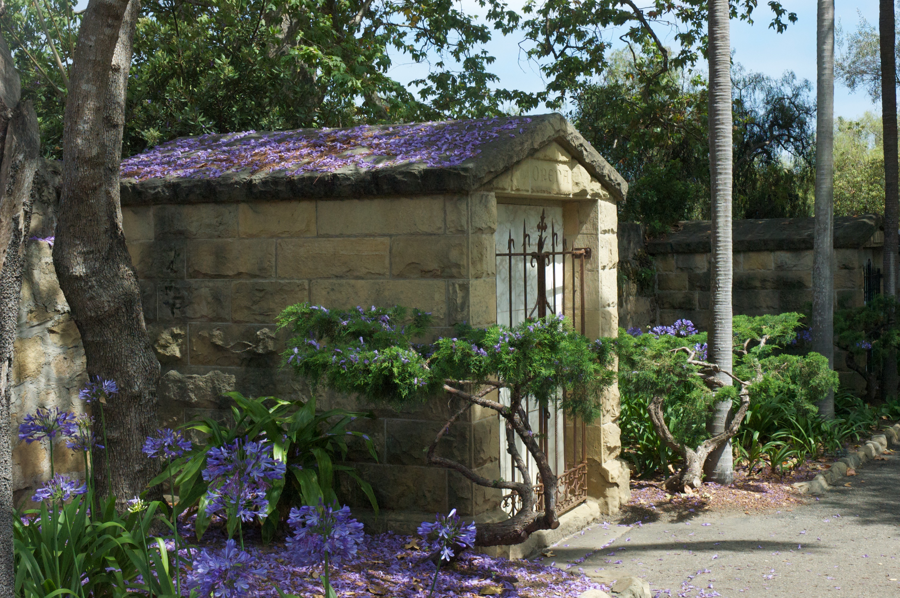 The cemetery is perhaps the highlight of the Mission grounds. In addition to the beauty of its landscaping and rustic stone walls, the cemetery has a number of well preserved crypts and memorials from different periods. The centerpiece of the cemetery is a gargantuan, gnarled Australian Moreton Fig tree. As you enter the church through the cemetery door, you will notice the traditional skulls and crossbones above the the archway. If you look closely you will notice that two of them are real human skulls set into the mortar.