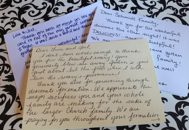 Hopefully engaging my daughter in this process is organically fostering her sense of gratitude. And can’t we all use opportunities to practice a little more gratitude? With both a baby soon on the way and the holidays right around the corner, I suspect opportunities will abound here at Das Schmidt Haus to express our collective gratitude. As much as I might be tempted to shoot a quick note via Facebook or email when treated to a kind gesture of hospitality or generosity, certainly such efforts are worthy of at least fifteen extra minutes of my time. So I’m taking on a personal challenge and giving myself permission to view these upcoming events as opportunities to handwrite notes of thanksgiving. I hope those extra minutes strengthen relationships, improve my cursive skills, and continue to foster a five-year-old’s fascination for letter writing.