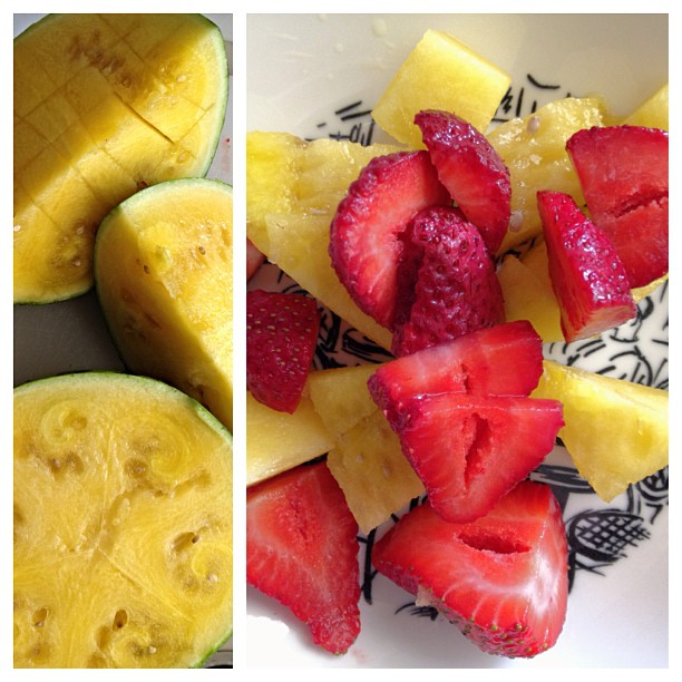 Chop fruit fresh from the refrigerator. Serve chilled alongside or on top of Mommy Waffles.
