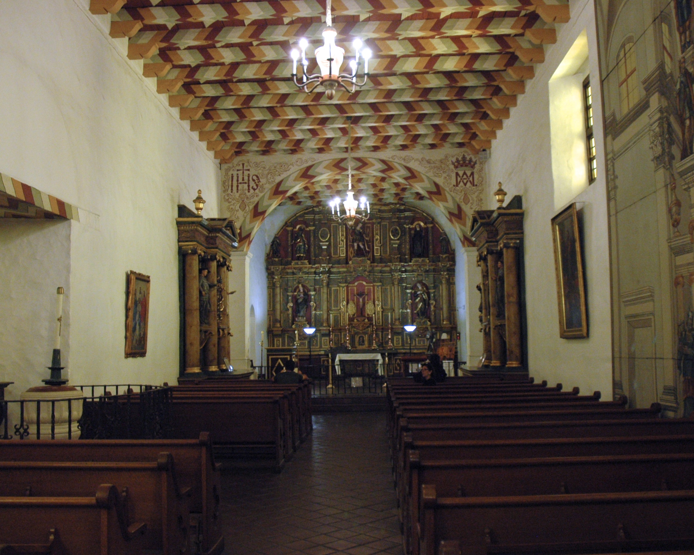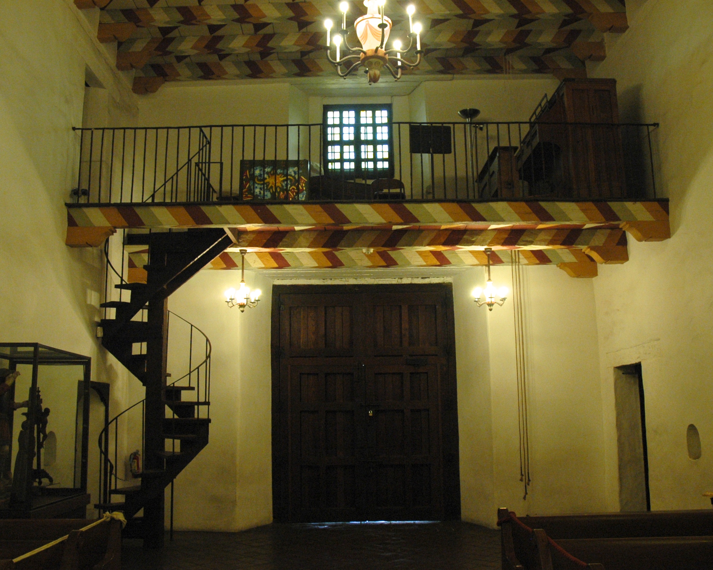 The Mission Church itself is tiny; its interior space is only 22 feet wide. Its narrow design and four-foot thick adobe walls are thought to be responsible for the church enduring the 1906 and 1989 earthquakes. Both inside and out, the Mission's appearance is close to what it was when the building was completed in 1791. A couple of striking features of the Mission Chapel are the hand painted wood ceiling and spiral stair case leading up to the organ loft.