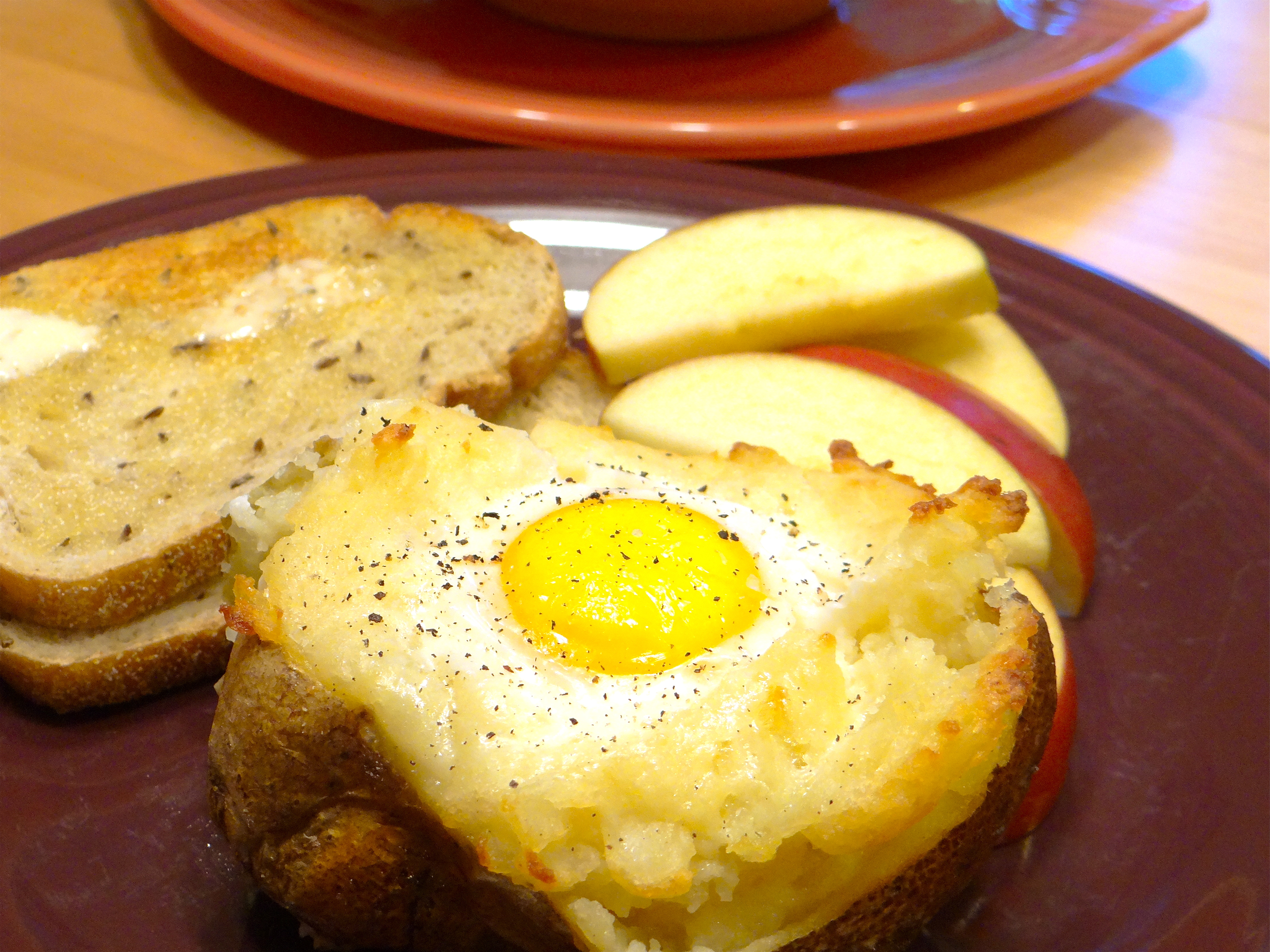 This recipe intrigued me, just by looks alone. Potatoes and eggs go great together, but an egg cooked in a potato? Really intriguing. Essentially it is similar to a twice-baked potato, but with a hole created in the filling where an egg is cracked and baked. The recipe called for sausage, but I omitted it to make a meatless meal. It would be delicious with sausage, but also with ham or bacon, for a Sunday brunch. I am listing the recipe as I made it below, but if you have ever made twice-baked potatoes, you know you really don't need a recipe. Bake the potatoes, cut off the top, scoop out much of the potato leaving a thin shell, mash potatoes with butter, parmesan cheese, sour cream or cream cheese, or a little milk and some shredded cheddar or Swiss. The combinations are endless -- adding meat or not -- just keep the potato mixture rather firm so that it holds the well needed to crack the egg into.