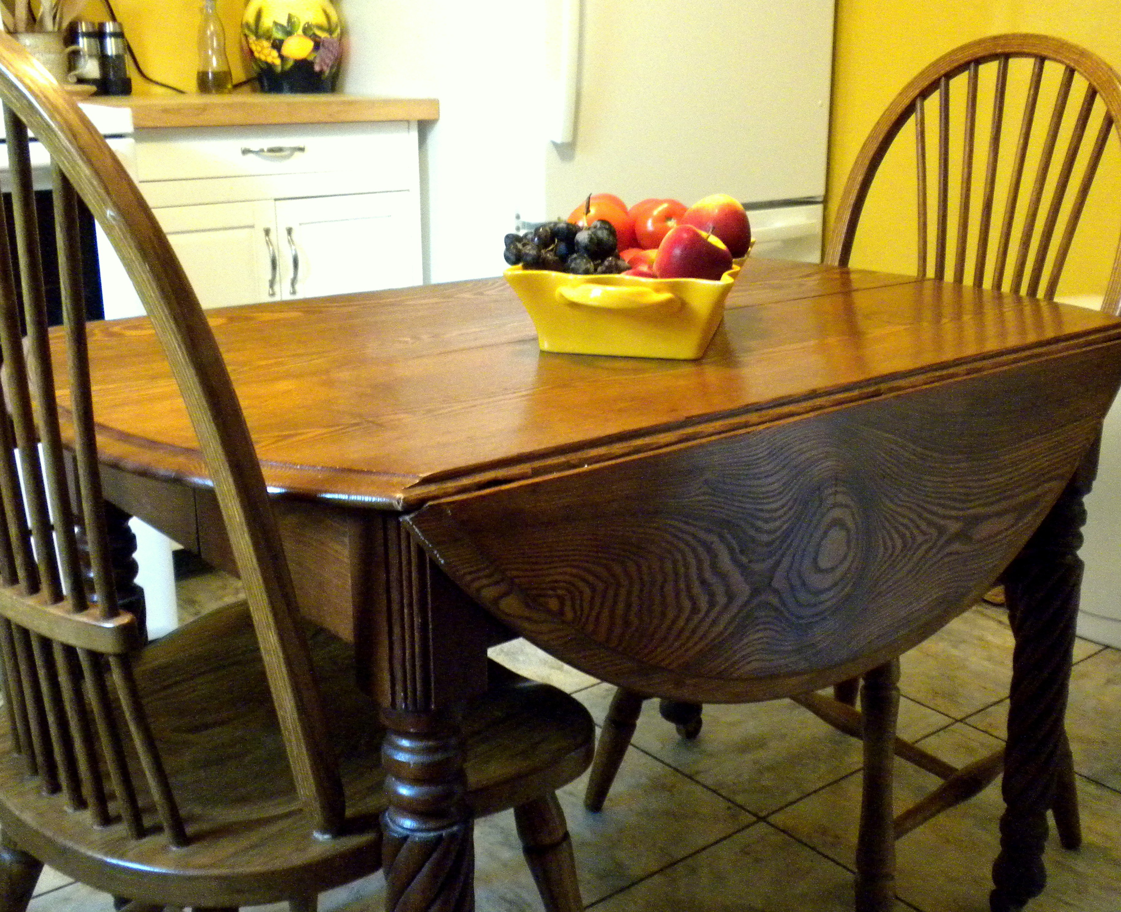 The table originally lived in her knotty-pine paneled galley kitchen, and was a mere three feet from the stove. We could check the buttermilk biscuits while seated, and enjoyed the warmth from the oven in winter. Dinners were spent in ease over small steaming plates. The old table creaked and groaned as we rested elbows upon it while leaning forward in conversation. The chairs had echoed back in their own voice of age.