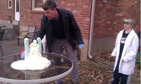My husband helped my son with an experiment called “Elephant Toothpaste”. He had the lab coat, the goggles and all the experimental goodies because of a teacher my husband knows, she was very kind to provide all of it. They videotaped the experiment for Spencer’s science class. They were able to observe some different reactions.