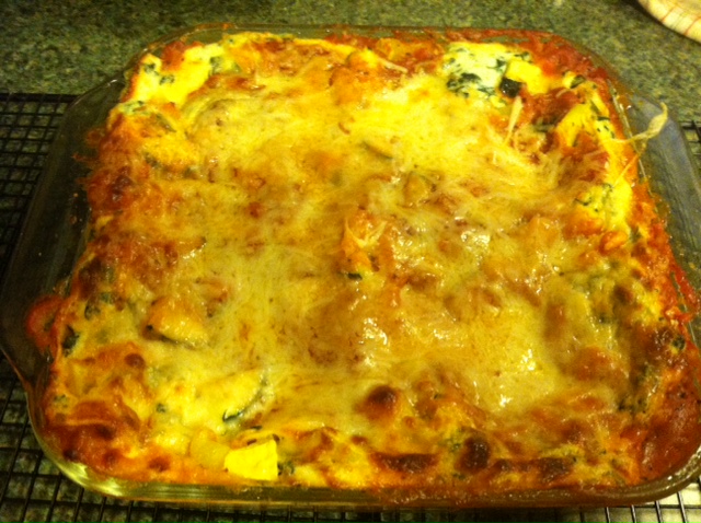 Spread a third of the marinara sauce over the bottom of a 9 by 13-inch baking dish. Arrange a layer of lasagna noodles on top. Spread a third of the ricotta mixture over the noodles, followed by a third of the cooked vegetables. Sprinkle with a third of the shredded cheese mixture. Repeat to make two more layers, ending with the shredded cheese mixture on top. Cover the top of the dish with aluminum foil and bake 30 minutes. Remove the foil and continue to bake until the top is golden brown, about 15 minutes more. Let cool at least 10 minutes before serving.