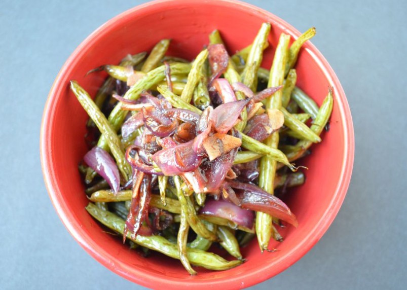 2. Place green beans and red onions on baking sheet and toss with olive oil, salt, & pepper.