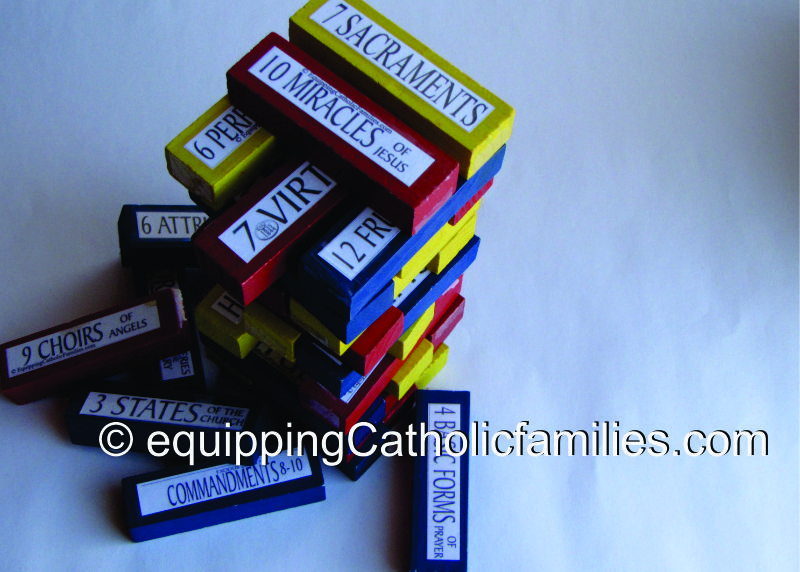 I have created a special Tower Tumble Template with Catechism categories and answers, formatted to fit to the neat little blocks. The game becomes a Catholic quizzing game, where players must list one (or all) of the terms corresponding with the category. The category is taped to the top of the block; the answers are taped to the bottom. If the player answers correctly, he keeps the block. The player who retains the most blocks wins! This game works well at home or even in the classroom!