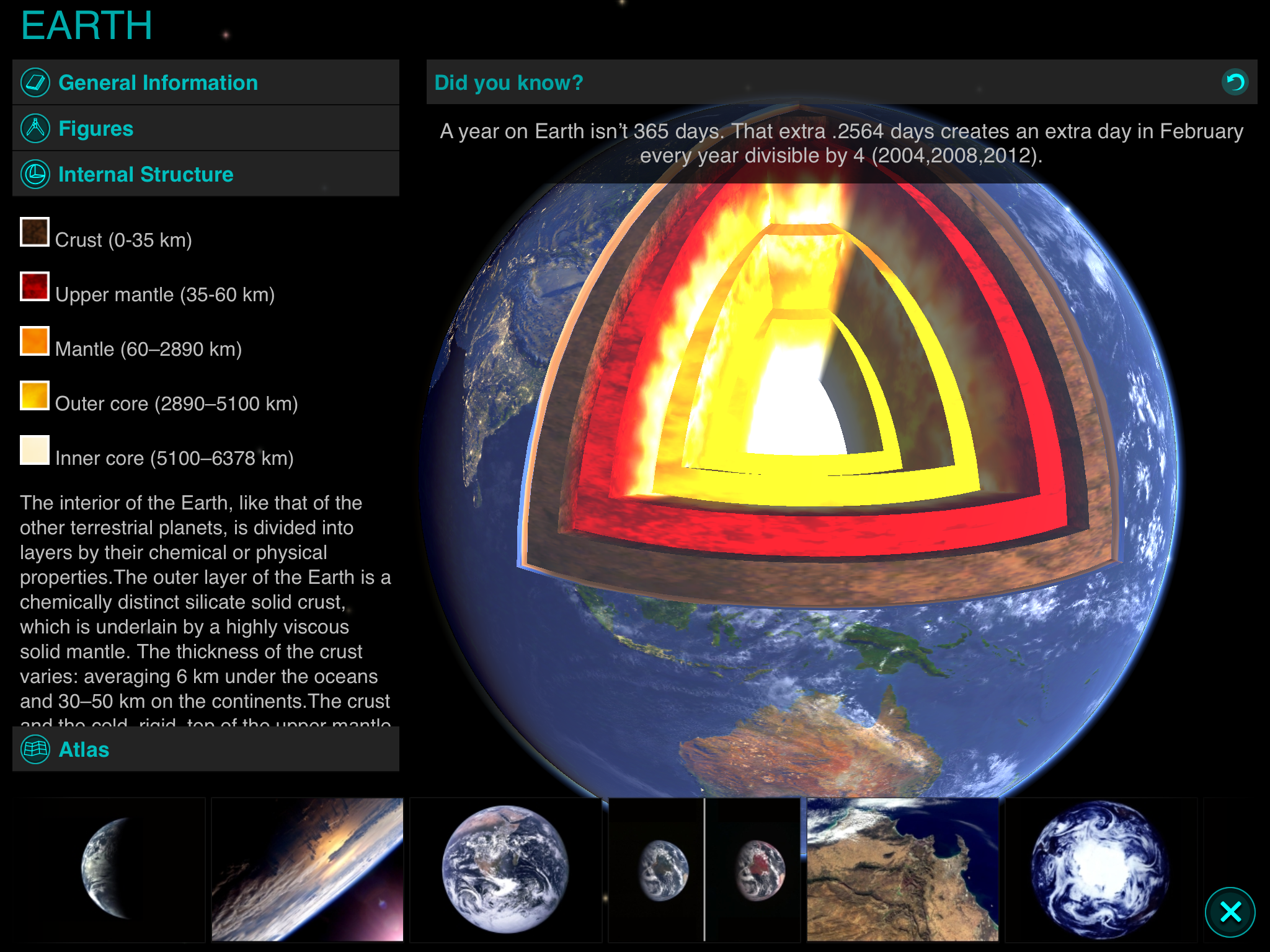 When you select a planet, you can explore the dimensions, learn about the relative gravity, and even learn about the interior of the planet. You can "fly" through the solar system, investigating the planets and their satellites, seeing how each looks from space while circling around it from any and all angles. There's a handy menu that you can use to select or search for what you're looking for.