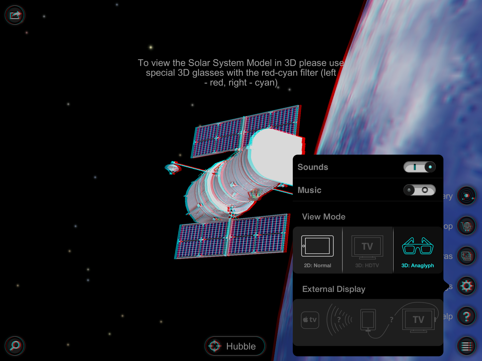 The app also has a 3D feature that works two different ways: either with regular red-cyan glasses (which you can pick up at a store; my older daughter got some at a Dollar Tree!) or with a 3D TV, using either your AppleTV or an HDMI adapter for your iPad (in which case, you'd use the 3D glasses that come with your TV).
