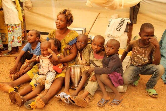 I almost didn’t hear the woman’s soft voice as I carefully make my way through the large, white tent housing several displaced families at Centre John 23, a parish compound in Bangui, the capital of the Central African Republic. I look down from where the voice had come from and see a woman, wearing a yellow dress and flip flops, sitting on a thin and frayed straw mat. A few moments earlier I had noticed the thick mud clumps that were forming under my shoes, the result of a heavy downpour earlier that morning that turned the ground into several inches of thick mud. Nathalie’s mat is spread out on that mud, some of her seven children sitting around her.