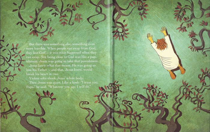 “You see, sin had come into God’s perfect world. And it would never leave. God’s children would be always running away from him and hiding in the dark. Their hearts would break now, and never work properly again. God couldn’t let his children live forever, not in such pain, not without him. There was only one way to protect them.