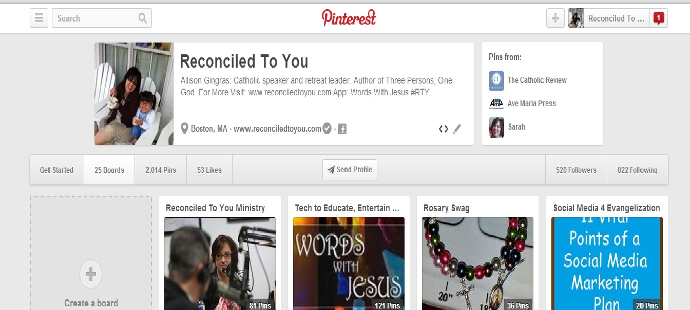 I’ve created very “Catholic-centric” content on my Pinterest – with fun boards entitled Catholic Peeps, Pope-ology and Rosary Swag. There are also more pragmatic boards such as Catholic Blogs, Social Media 4 Evangelization, and Catholic Cache. Recently, as if I had been living in a shoe, I was made aware of one of the MOST EXTENSIVE Catholic resource boards on Pinterest, simply titled: Catholic Pinterest . I’m still scratching my head at how I missed this board as it was launched or “christened” (as the board description says), by Allison Girone, whom I met virtually after someone incorrectly tagged one of us in place of the other. [As an aside: this actually happens to us a lot. I’ve even had moments of seeing her name next to a pin, post or image and thought, “hmm, when did I post that?” See how much fun social media can be – yes I am that easily amused. ]